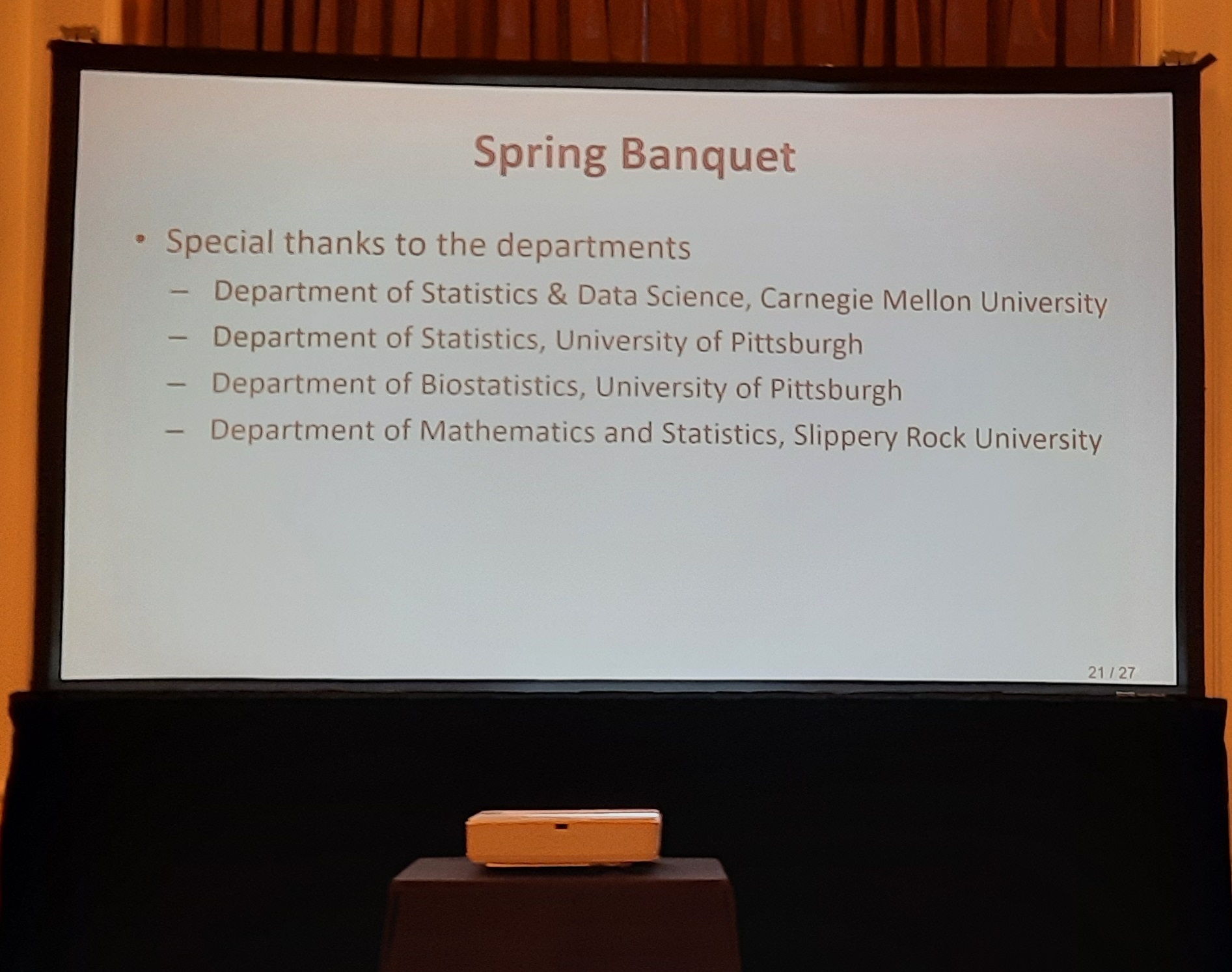 The banquet featured a poster presentation session (including a student poster contest for the Mihaela Serban Award) at 5-6PM; a keynote banquet speech delivered by Dr. Kathryn Roeder, the UPMC Professor of Statistics and Life Sciences in the Departments of Statistics and Data Science and Computational Biology at CMU (6-7PM); presentation of student awards; recognition of various Chapter members’ accomplishments in the 2021-2022 academic year; and concluded with the presentation of the 2022 Statistician of the Year award.