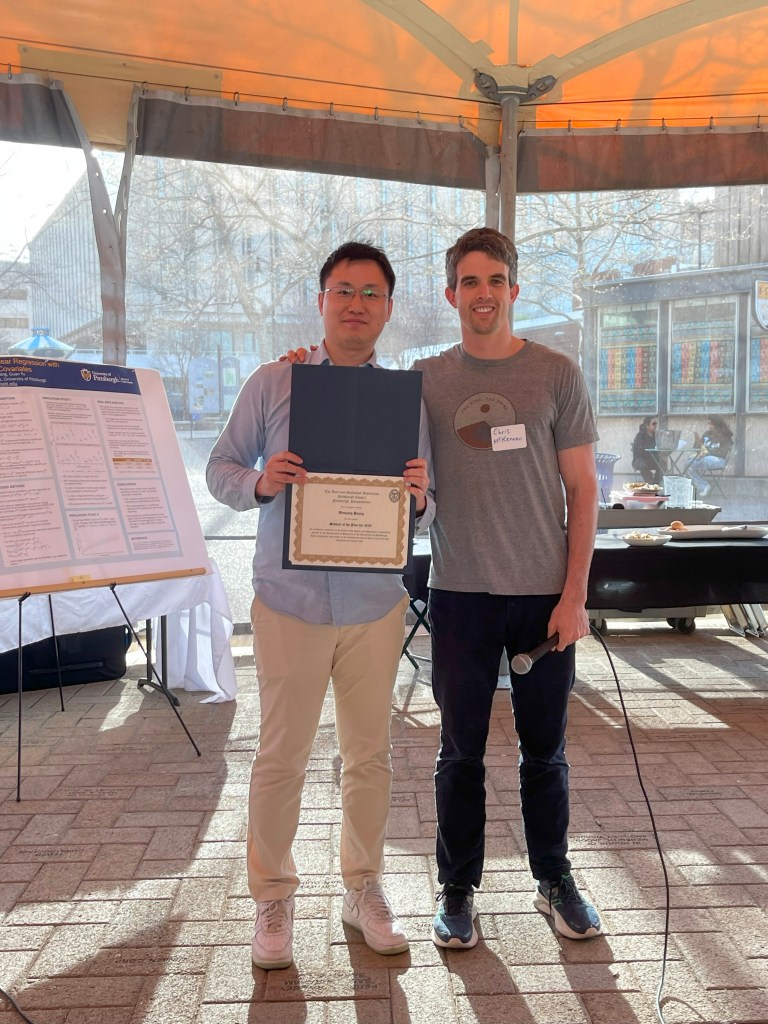 The event kicked off with the poster award competition, which more than twenty graduate students participated. The winners were Ergan Shang (CMU) and Weiqiong Huang (Pitt Stat), recognized for their outstanding research presentations. Ergan was also the Miheala Serban Poster Award Winner.